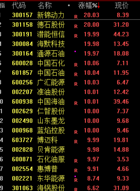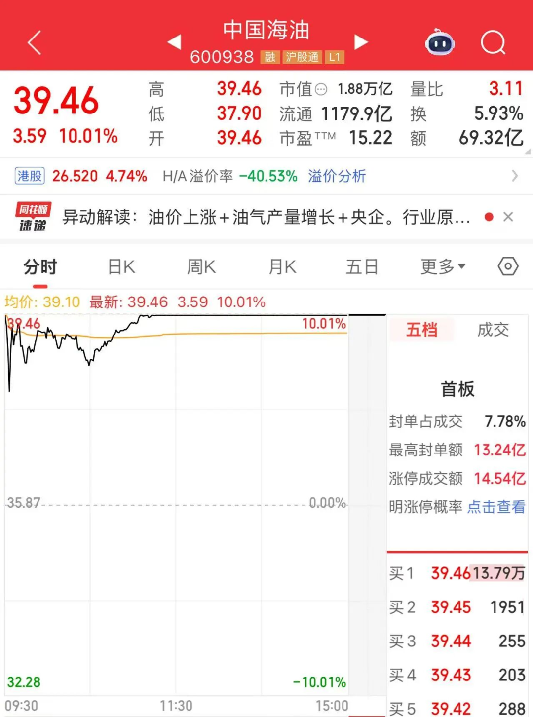 在中国石油的率领下,油气板块午后掀翻涨停潮。此前,中国海油、科力股份、通源石油、新锦能源、贝肯能源等约20只个股纷纷涨停,首华燃气、凯添燃气、海默科技等个股涨幅也均逾越10%。商场热度可见一斑。