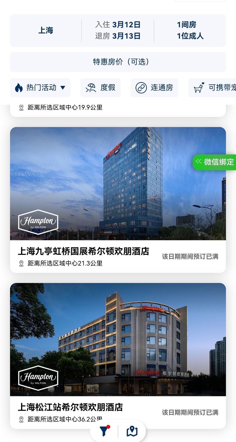 希尔顿集团旗下多家酒店显示满房。 均手机截屏